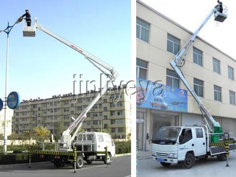 一种利用汽车引擎动力驱动的折臂式高空作业车。车辆的行走功能,使升降平台有更好的灵活性和机动性,使高空作业效率更高。折臂结构紧凑,采用新型优质型钢,强度高,重量轻,架设速度快,工作台既可升高又可水平延伸,还可旋转360度,易于跨越障碍到达工作位置。